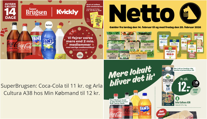 SuperBrugsen tilbyder Coca-Cola, Fanta eller Schweppes i forskellige varianter på 125-150 cl til en pris af kun 11 kr. pr. flaske. Dette tilbud gælder fra fredag den 6. februar til torsdag den 19. februar 2026.